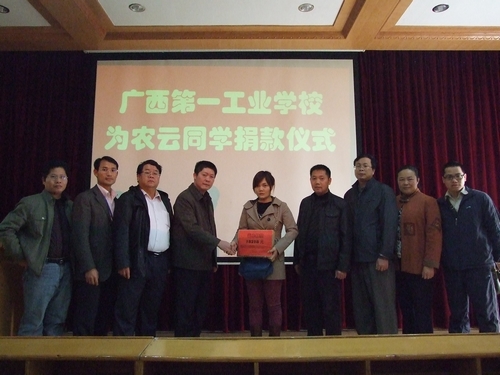 “感謝一工校的老師同學(xué)們!你們雪中送炭的行動(dòng)讓我們?nèi)毅懹浽谛?hellip;…”1月23日上午,農(nóng)云同學(xué)的姐姐農(nóng)慈珍激動(dòng)地接過(guò)一個(gè)紅色的大信封,這是廣西第一工業(yè)學(xué)校的師生們?yōu)榘籽』颊咿r(nóng)云同學(xué)募捐所得的18218元。近日,廣西第一工業(yè)學(xué)校師生為該校一位突患白血病的學(xué)生進(jìn)行捐款,點(diǎn)點(diǎn)愛(ài)心匯聚一起,千余名師生聚合正能量向他伸出了援助之手。