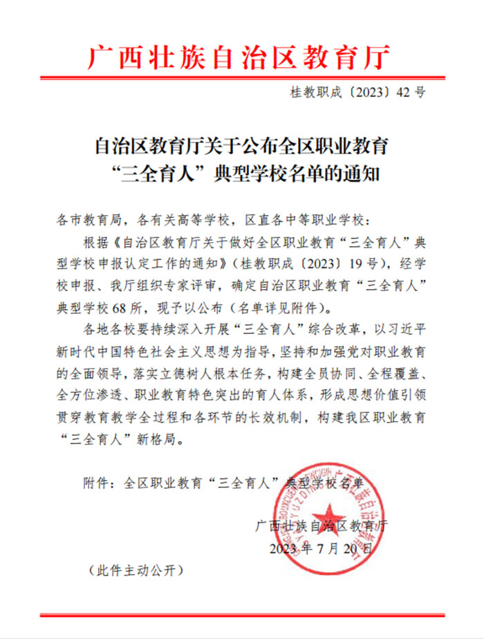 近日,自治區(qū)教育廳公布全區(qū)職業(yè)教育“三全育人”典型學校名單,廣西第一工業(yè)學校名列其中。