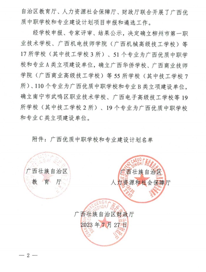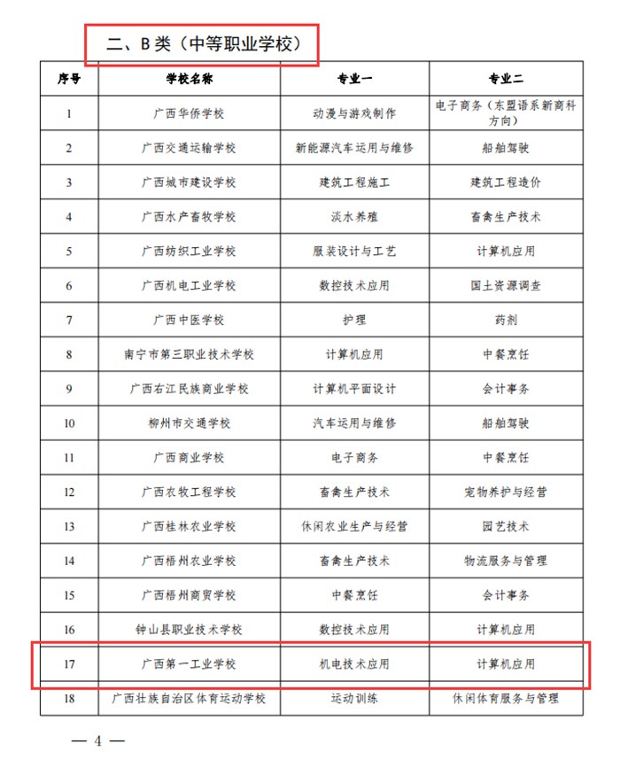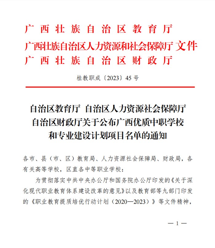 近日,自治區(qū)教育廳、自治區(qū)人社廳、自治區(qū)財(cái)政廳聯(lián)合發(fā)文公布廣西優(yōu)質(zhì)中職學(xué)校和專業(yè)建設(shè)計(jì)劃項(xiàng)目名單,廣西第一工業(yè)學(xué)校被確立為廣西優(yōu)質(zhì)中職學(xué)校和專業(yè)B類立項(xiàng)建設(shè)單位,機(jī)電技術(shù)應(yīng)用、計(jì)算機(jī)應(yīng)用兩個(gè)專業(yè)入選專業(yè)B類建設(shè)計(jì)劃,為十四五良好開局、實(shí)現(xiàn)新時(shí)代職業(yè)教育高質(zhì)量發(fā)展開啟了新征程。