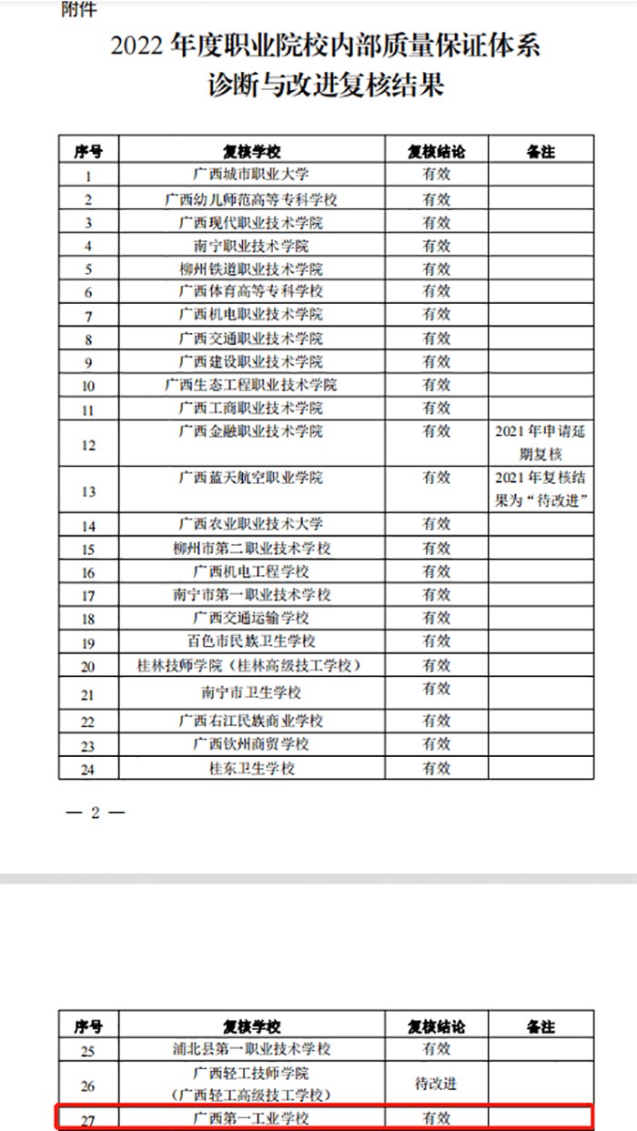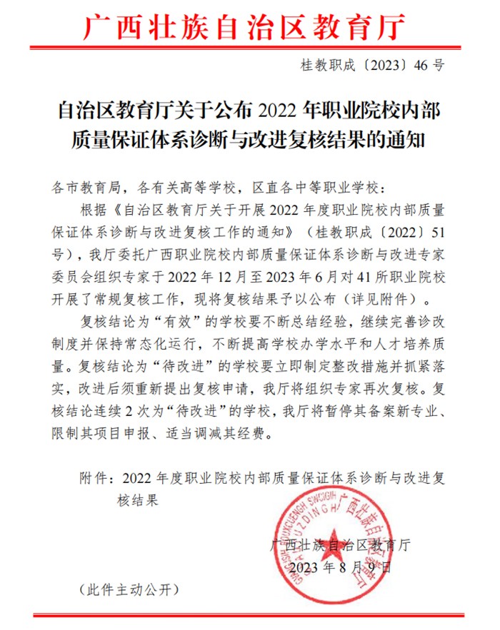 近日,自治區(qū)教育廳印發(fā)《自治區(qū)教育廳關(guān)于公布2022年職業(yè)院校內(nèi)部質(zhì)量保證體系診斷與改進復(fù)核結(jié)果的通知》(桂教職成〔2023〕46號),經(jīng)審定,我校內(nèi)部質(zhì)量保證體系診斷與改進復(fù)核結(jié)論為“有效”,順利通過復(fù)核。
